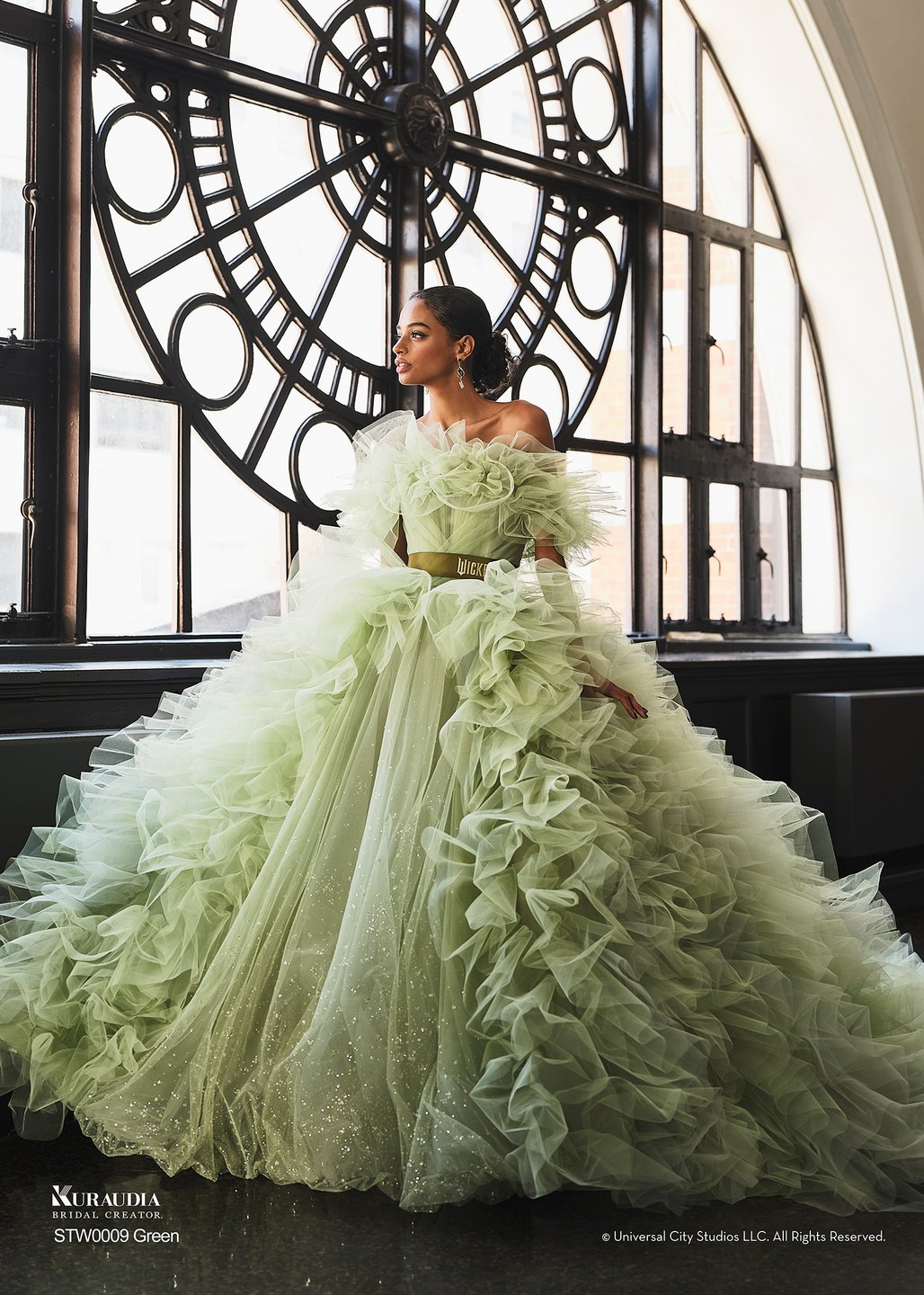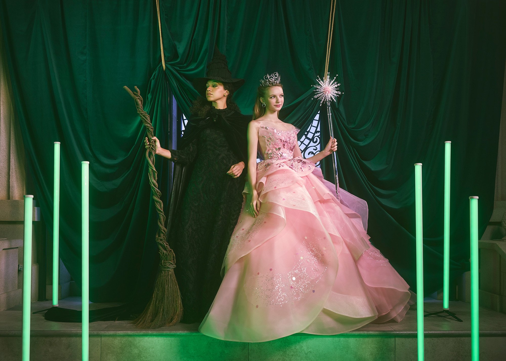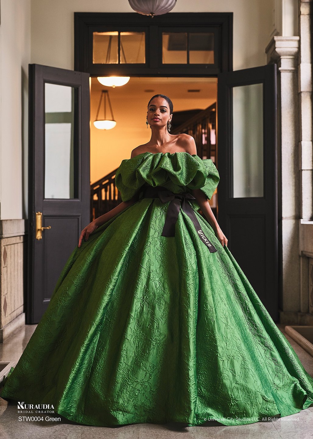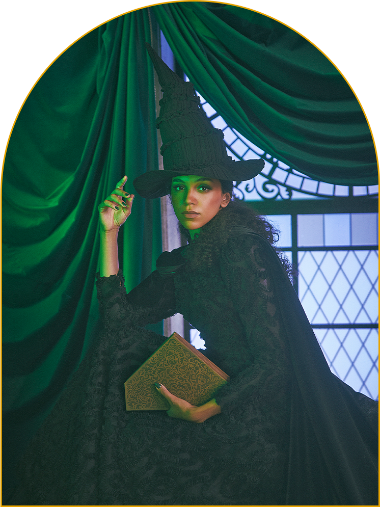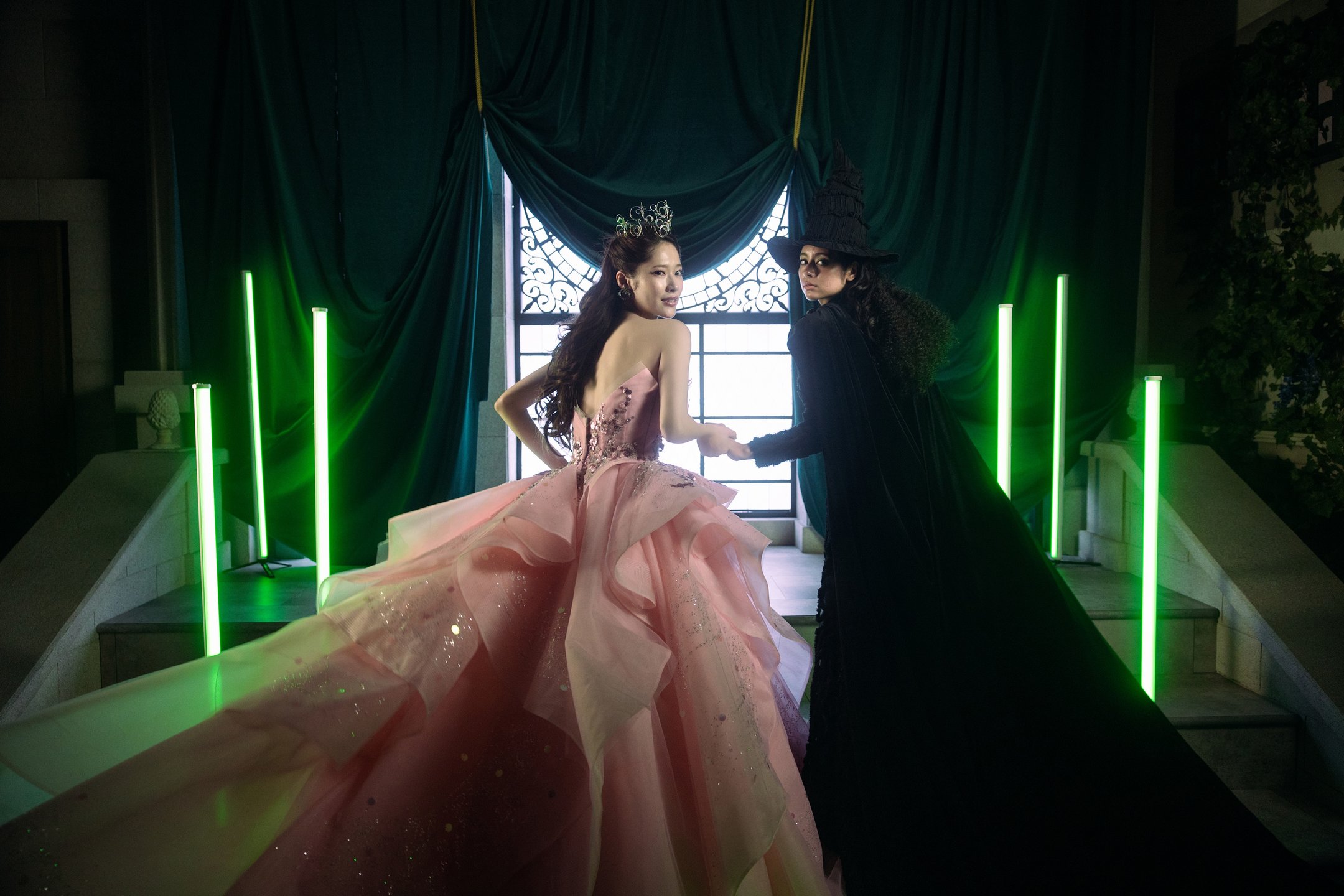 その強さと美しさを表現したドレスに、帽子・マント・ほうきなどの象徴的なアイテムを添えて、「エルファバ」の世界を纏った撮影が叶います。